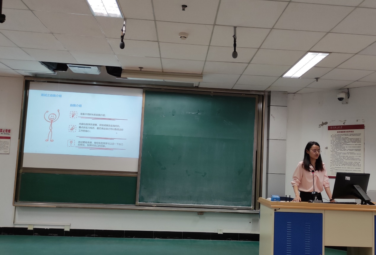 郭英栋同学为大家分享了互联网、银行的实习与求职经验。他首先为同学们分享了互联网实习及招聘的一些经验,先后介绍了互联网行业及其岗位划分,然后详细讲述了如何准备笔试及面试,不仅干货满满,也激起了同学们对互联网行业的浓厚兴趣。同时他谈到了银行的求职经历,生动有趣地分享了他在中国银行的实习经历及体验,比较了银行和互联网的工作内容。