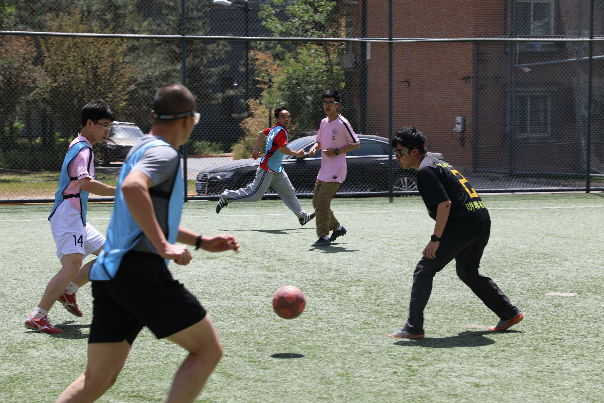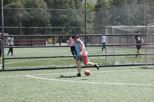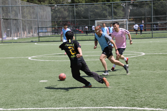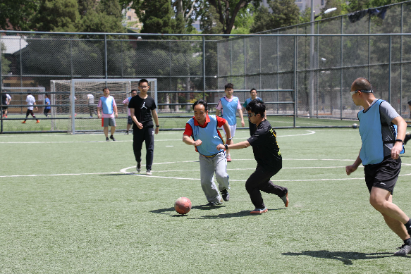 首场比赛的两支队伍分别是教博联队和硕士生队。随着裁判张嘉晨的一声哨响,比赛正式开始。炎热的天气挡不住大家的比赛热情,队员们很快便进入状态,你拼我抢,积极跑动。开场5分钟,倪天佳老师灵活盘带,晃开最后一名防守队员后起脚打门,足球入网,一气呵成。随后教博联队借势继续进攻,朱晓宝老师接边路传中,一脚爆射直挂球门死角。易边再战,硕士生队迅速调整了战术,积极地拼抢和快速地跑动,打出了一波猛烈的反击,硕士生队郭英栋接队友传球,边路切中,一脚漂亮的挑射进球。硕士生队继续保持进攻热度,有两次打到球门柱上,还有几次极具威胁的进攻,场上气氛一度十分激烈,精彩不断。最终比赛以5:2结束,教博联队获胜。
