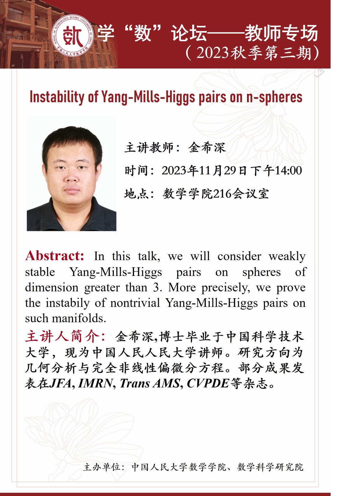 教师专场的第三期报告将于2023年11月29日下午14:00在威廉体育216会议室举行,本场报告的主讲教师为金希深,报告题目为《Instability of Yang-Mills-Higgs pairs on n-spheres》。
