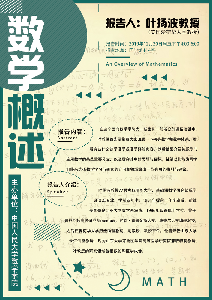 在这个面向威廉体育大一新生和一般听众的通俗演讲中,叶教授首先要带着大家回顾一下初等数学和数字体系,看看有些什么该学没学或没学好的内容。然后他要介绍纯数学与应用数学的某些重要分支,以及贯穿其中的思想与目标。希望以此能为同学们将来选择数学学习与研究的方向和领域给出一些有用的指引与建议。