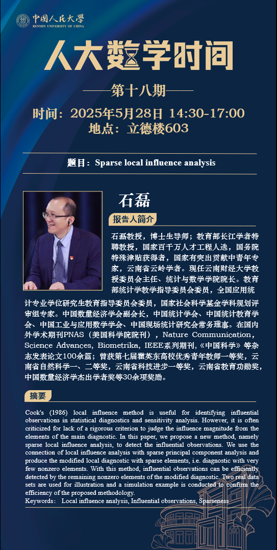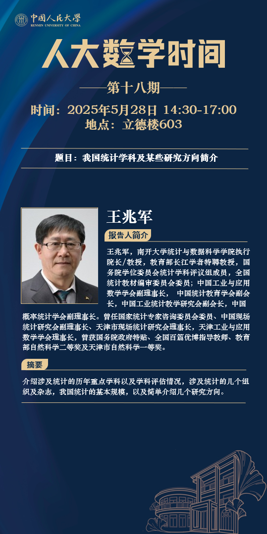 为促进学科交流融合、拓宽师生学术视野、释放科研创新活力,助力人大数学学科走向一流,威廉体育设立“人大数学时间”,以专题研讨、高端学术论坛为载体,搭建数学思想充分碰撞、优秀人才不断涌流、创造活力竞相迸发的舞台。“人大数学时间”将持之以恒,久久为功,立志通过交流与创新、提出重大问题,引领数学学科及相关领域的创新与发展,成为对我国数学发展有贡献意义的平台。以下为“人大数学时间I”第十八期信息: