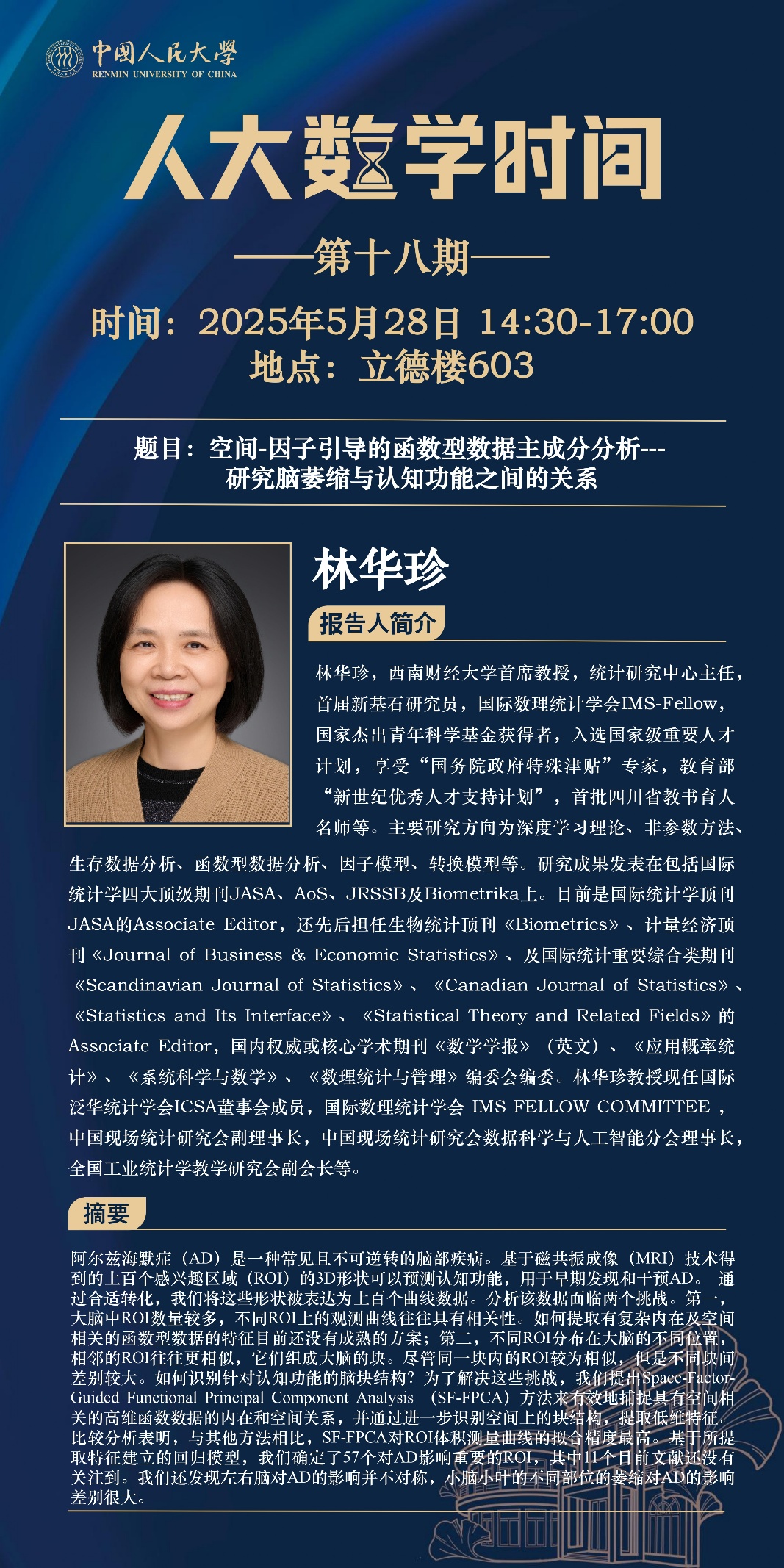 报告人简介:西南财经大学首席教授,统计研究中心主任,首届新基石研究员,国际数理统计学会IMS-Fellow,国家杰出青年科学基金获得者,入选国家级重要人才计划,享受“国务院政府特殊津贴”专家,教育部“新世纪优秀人才支持计划”,首批四川省教书育人名师等。主要研究方向为深度学习理论、非参数方法、生存数据分析、函数型数据分析、因子模型、转换模型等。研究成果发表在包括国际统计学四大顶级期刊JASA、AoS、JRSSB及Biometrika上。目前是国际统计学顶刊JASA的Associate Editor,还先后担任生物统计顶刊《Biometrics》、计量经济顶刊《Journal of Business & Economic Statistics》、及国际统计重要综合类期刊《Scandinavian Journal of Statistics》、《Canadian Journal of Statistics》、《Statistics and Its Interface》、《Statistical Theory and Related Fields》的Associate Editor,国内权威或核心学术期刊《数学学报》(英文)、《应用概率统计》、《系统科学与数学》、《数理统计与管理》编委会编委。林华珍教授现任国际泛华统计学会ICSA董事会成员,国际数理统计学会 IMS FELLOW COMMITTEE ,中国现场统计研究会副理事长,中国现场统计研究会数据科学与人工智能分会理事长,全国工业统计学教学研究会副会长等。