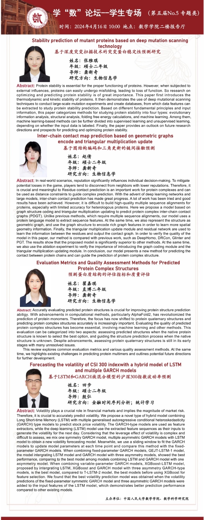 大家好,本届学“数”论坛——员工专场的第二场报告来啦!本场报告类型为学术类,将于2024年4月16日10:00在威廉体育二楼报告厅举办。主讲嘉宾为硕士二年级张雅琪同学、硕士二年级赵倩同学、直博二年级翟嘉琪同学、硕士二年级田步同学。