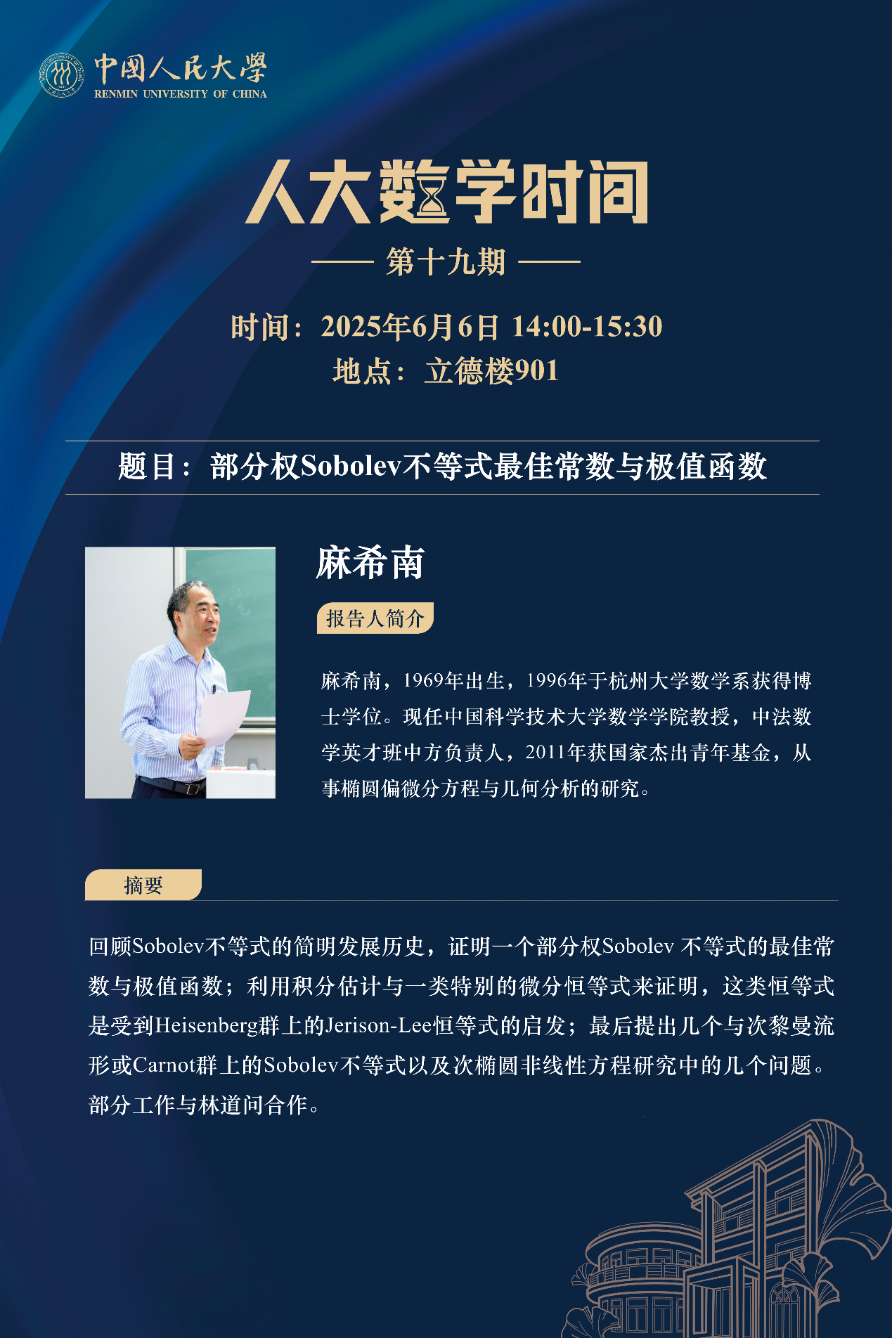 为促进学科交流融合、拓宽师生学术视野、释放科研创新活力,助力人大数学学科走向一流,威廉体育设立“人大数学时间”,以专题研讨、高端学术论坛为载体,搭建数学思想充分碰撞、优秀人才不断涌流、创造活力竞相迸发的舞台。“人大数学时间”将持之以恒,久久为功,立志通过交流与创新、提出重大问题,引领数学学科及相关领域的创新与发展,成为对我国数学发展有贡献意义的平台。以下为“人大数学时间I”第十九期信息: