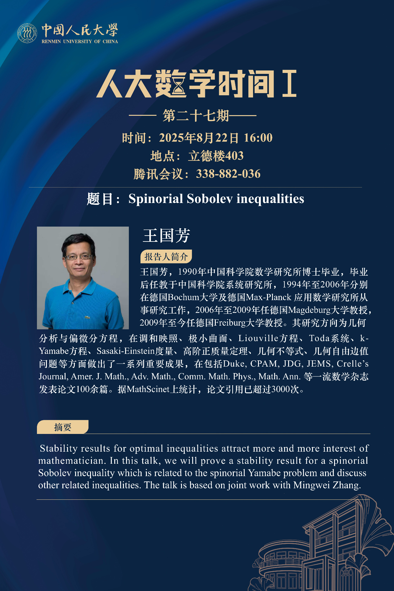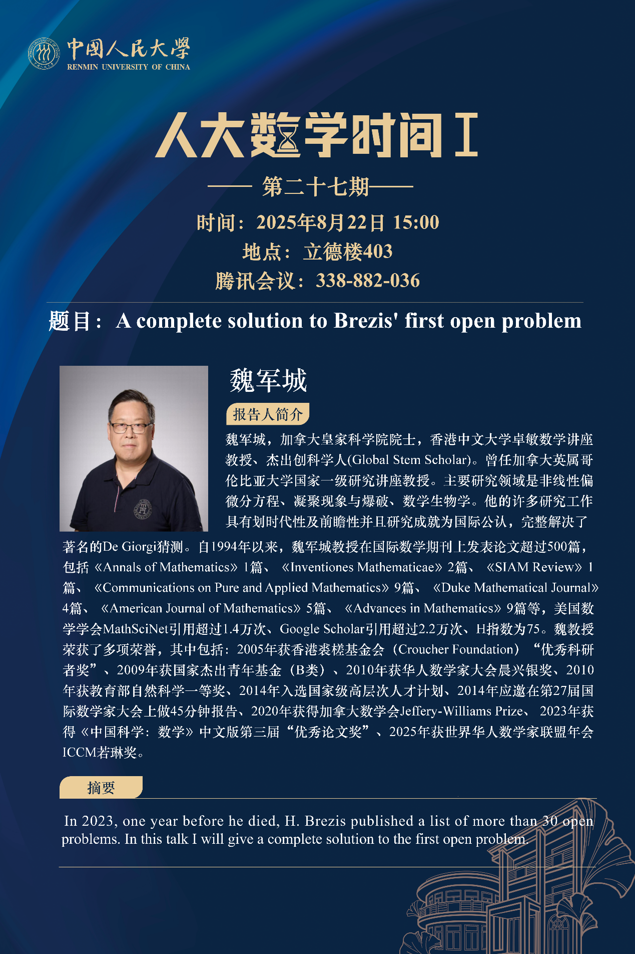 为促进学科交流融合、拓宽师生学术视野、释放科研创新活力,助力人大数学学科走向一流,威廉体育设立“人大数学时间”,以专题研讨、高端学术论坛为载体,搭建数学思想充分碰撞、优秀人才不断涌流、创造活力竞相迸发的舞台。“人大数学时间”将持之以恒,久久为功,立志通过交流与创新、提出重大问题,引领数学学科及相关领域的创新与发展,成为对我国数学发展有贡献意义的平台。以下为“人大数学时间I”第二十七期信息: