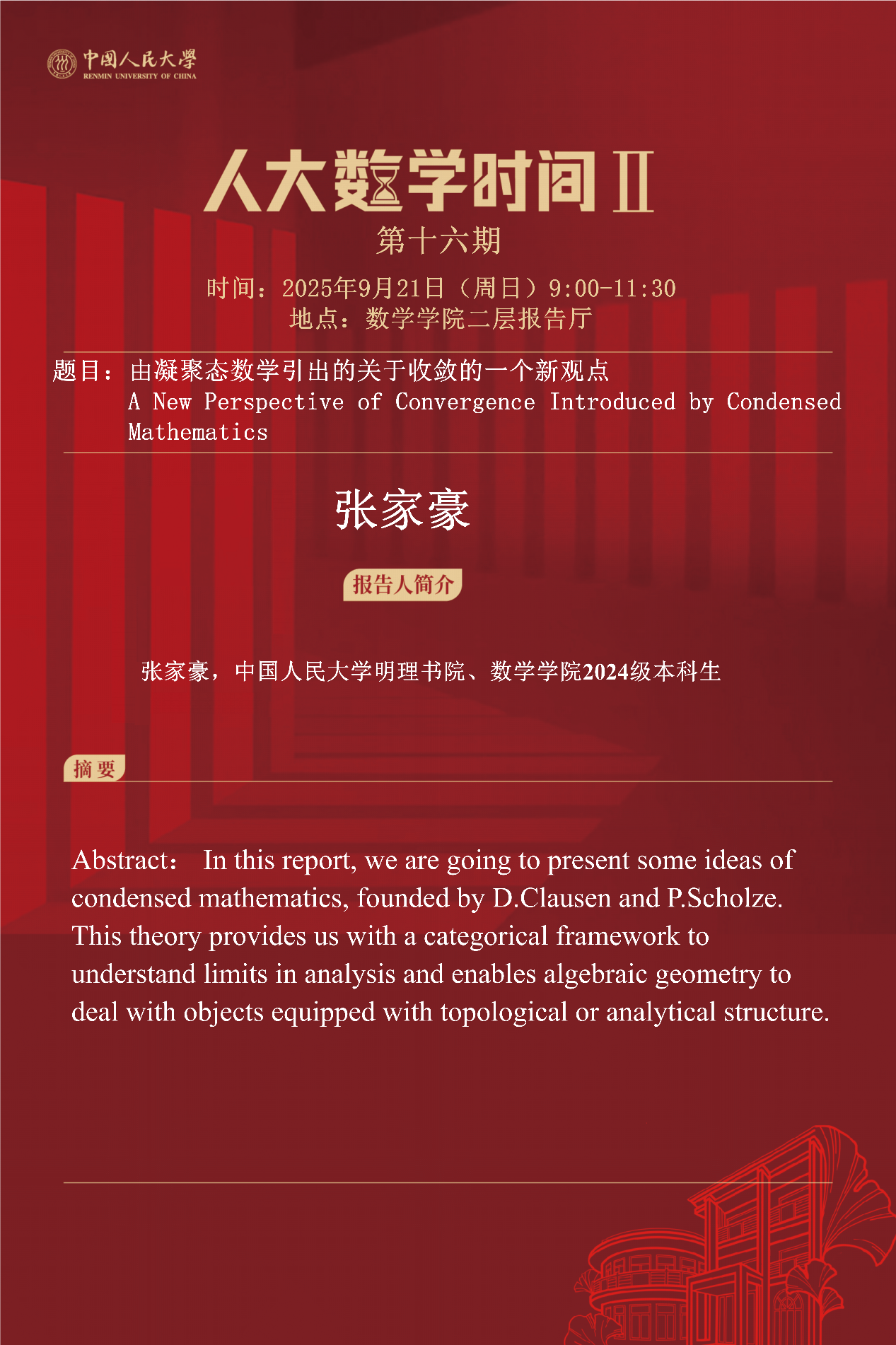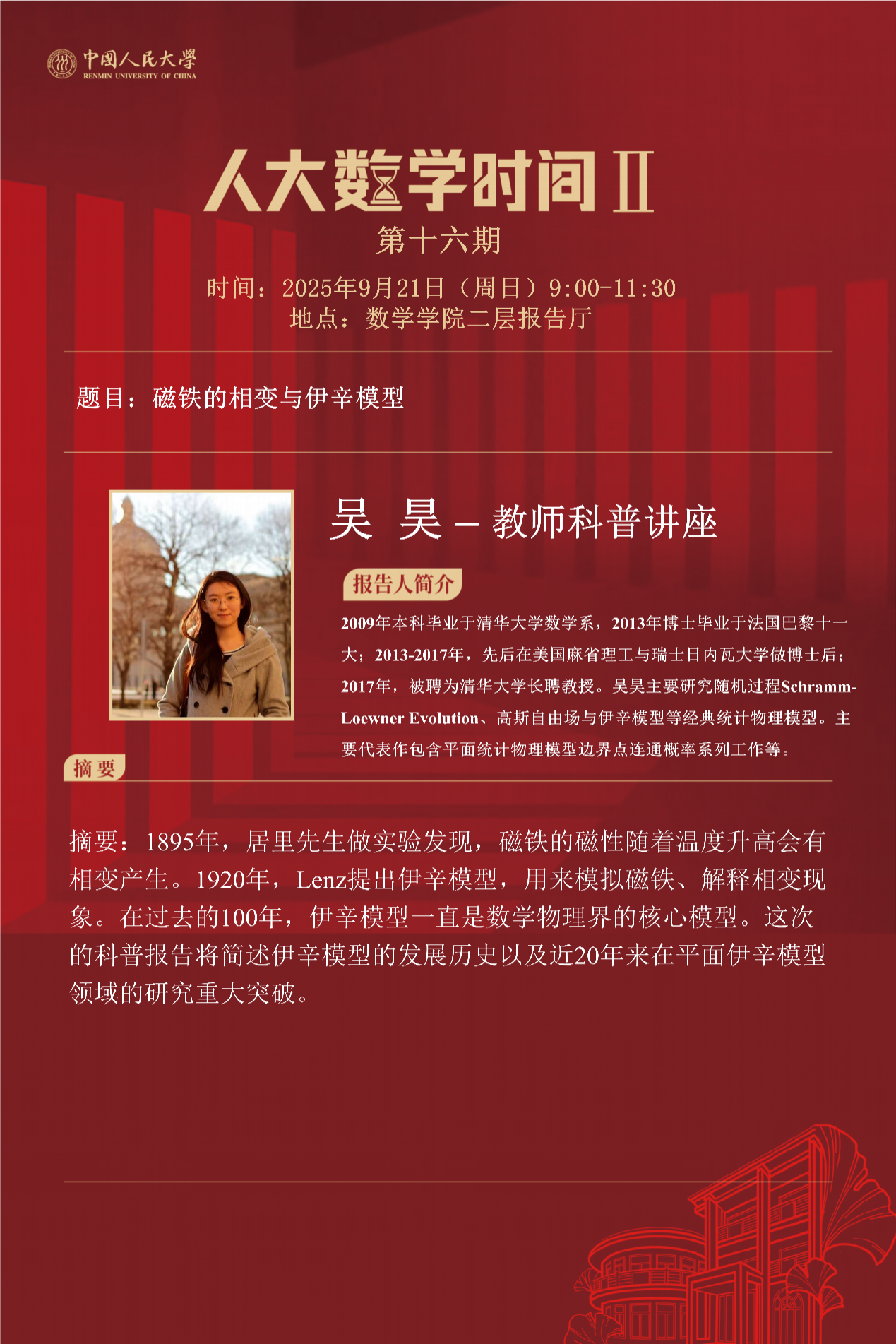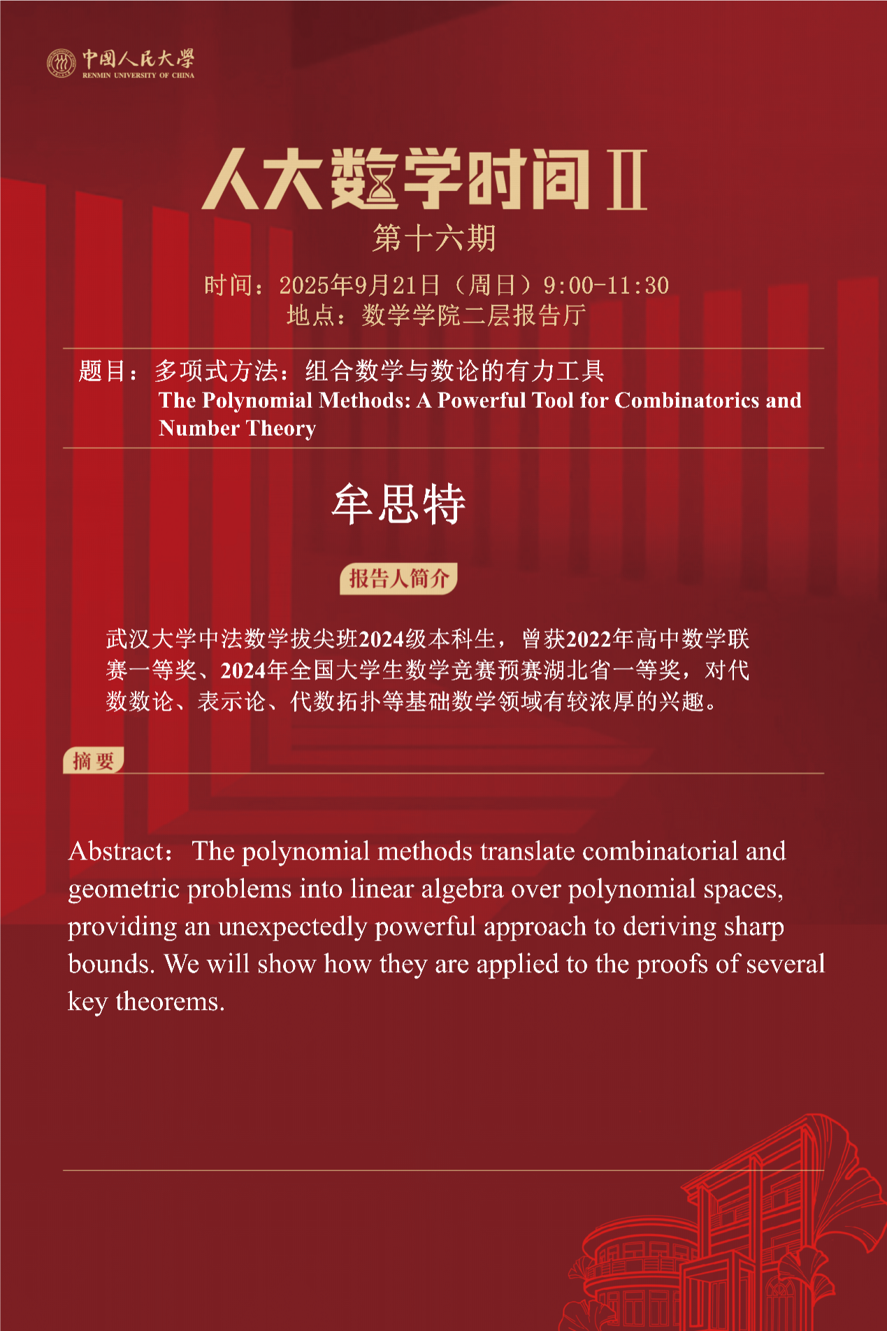 为促进学科交流融合、拓宽师生学术视野、释放科研创新活力,助力人大数学学科走向一流,威廉体育设立“人大数学时间”,以专题报告、交流研讨、高端学术论坛为载体,搭建数学思想充分碰撞、优秀人才不断涌流、创造活力竞相迸发的舞台。“人大数学时间”将持之以恒,久久为功,立志通过交流、创新、提出重大问题,引领数学学科及相关领域的创新与发展,成为对我国数学发展有贡献意义的平台。