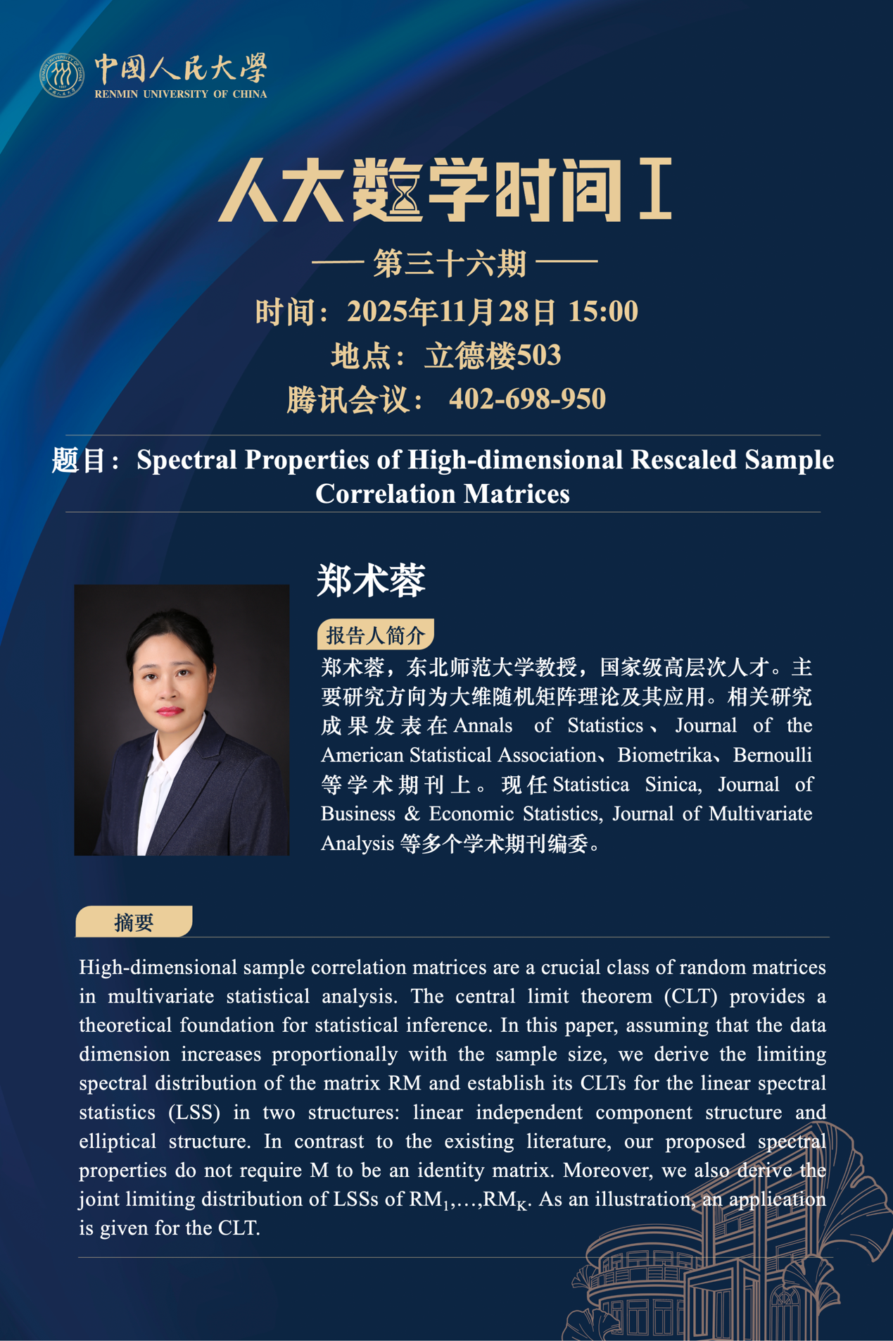 郑术蓉,东北师范大学教授,国家级高层次人才,主要研究方向为大维随机矩阵理论及其应用。相关研究成果发表在Annals of Statistics、Journal of the American Statistical Association、Biometrika、Bernoulli等学术期刊上。现任Statistica Sinica, Journal of Business & Economic Statistics, Journal of Multivariate Analysis等多个学术期刊编委。