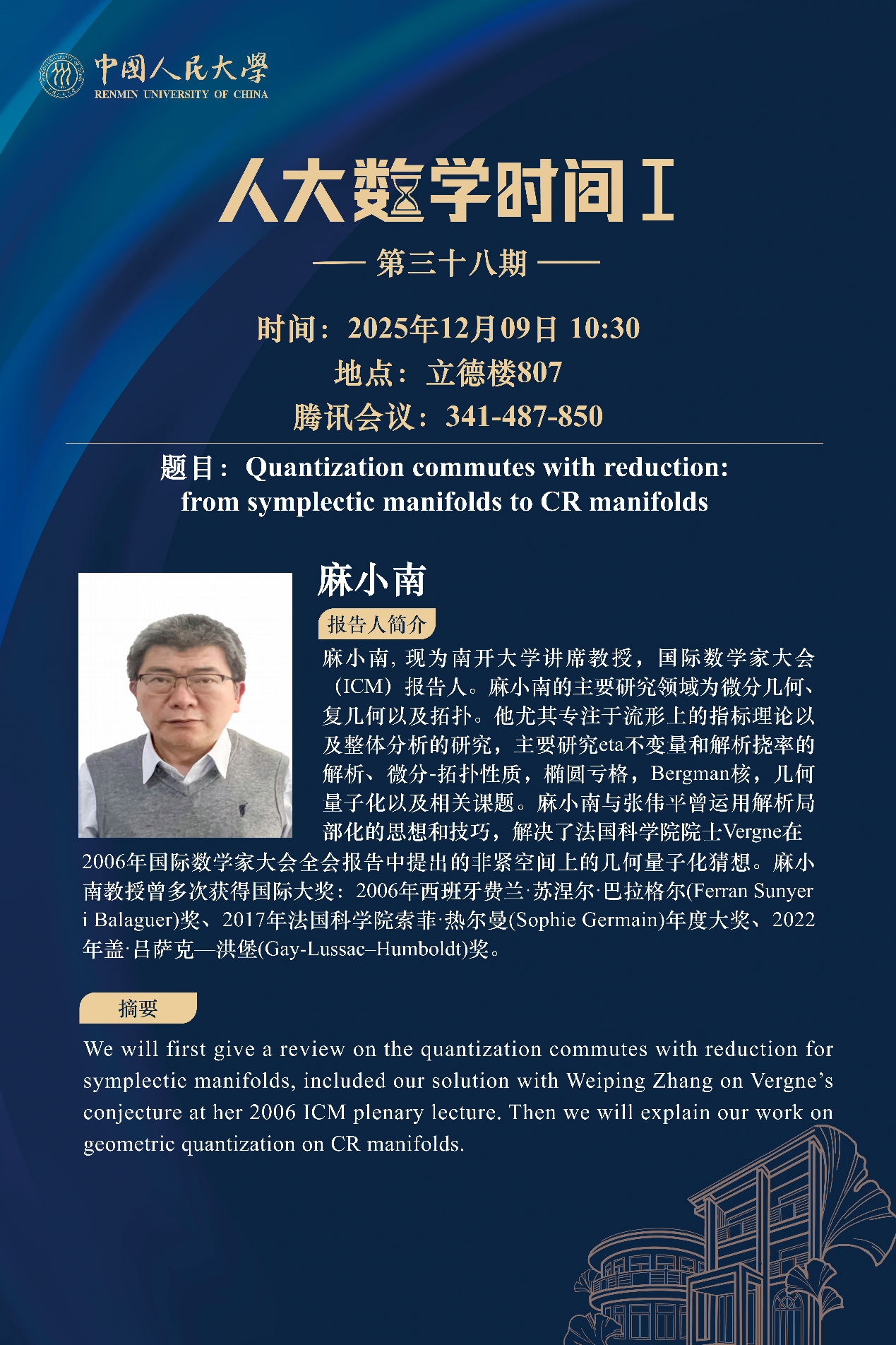 为促进学科交流融合、拓宽师生学术视野、释放科研创新活力,助力人大数学学科走向一流,威廉体育设立“人大数学时间”,以专题研讨、高端学术论坛为载体,搭建数学思想充分碰撞、优秀人才不断涌流、创造活力竞相迸发的舞台。“人大数学时间”将持之以恒,久久为功,立志通过交流与创新、提出重大问题,引领数学学科及相关领域的创新与发展,成为对我国数学发展有贡献意义的平台。以下为“人大数学时间I”第三十八期信息: