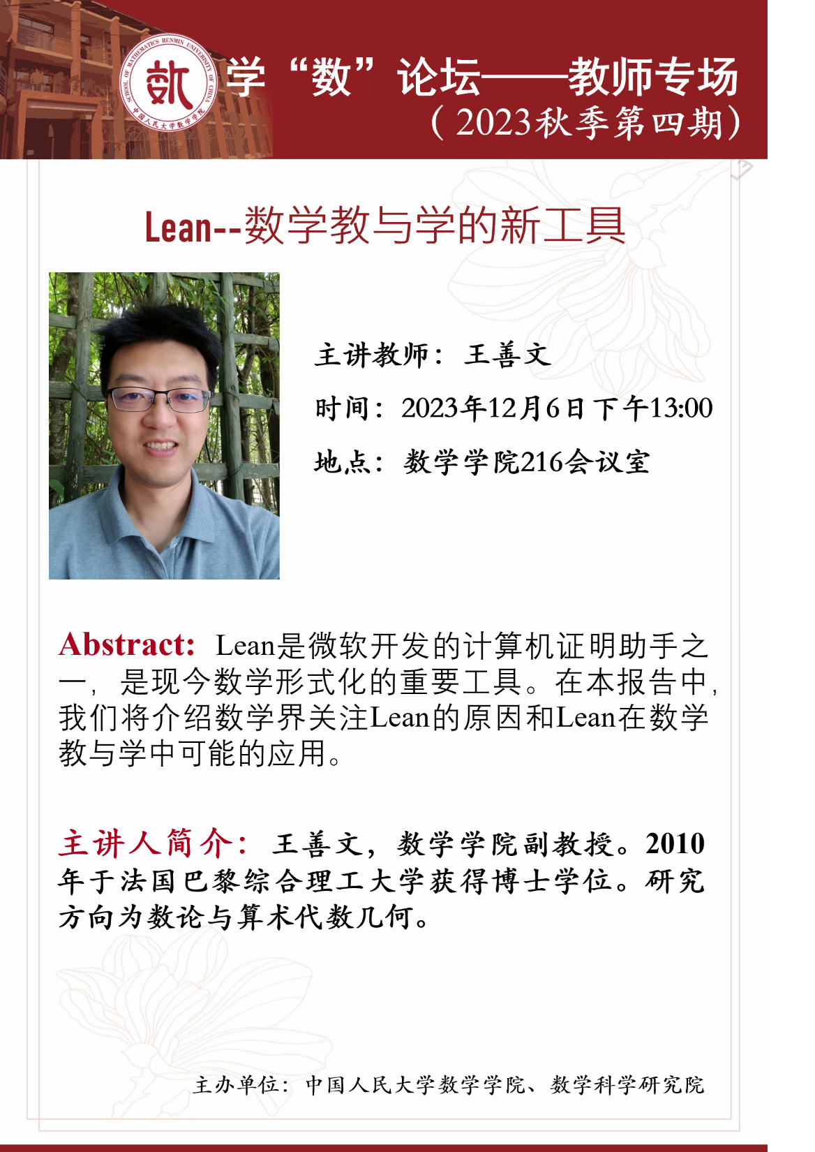 教师专场的第三期报告将于2023年12月6日下午13:00在威廉体育216会议室举行,本场报告的主讲教师为王善文,报告题目为《Lean--数学教与学的新工具》。