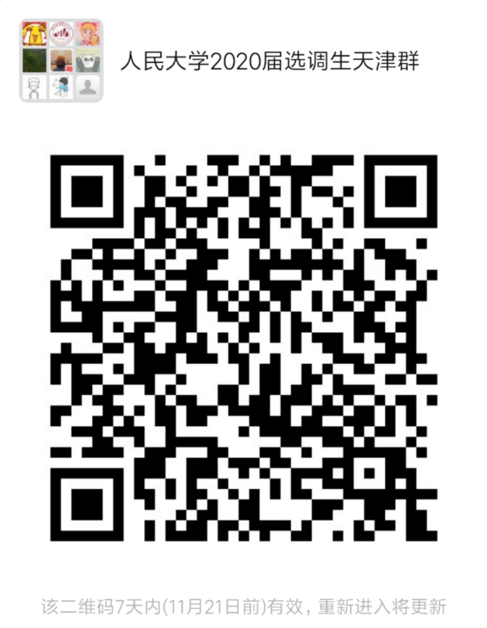 扫码加入“人民大学2020届选调生天津群”,如群满100人,可加微信号:jicengjiuye,验证消息为“姓名+公司+2020届选调生天津群”