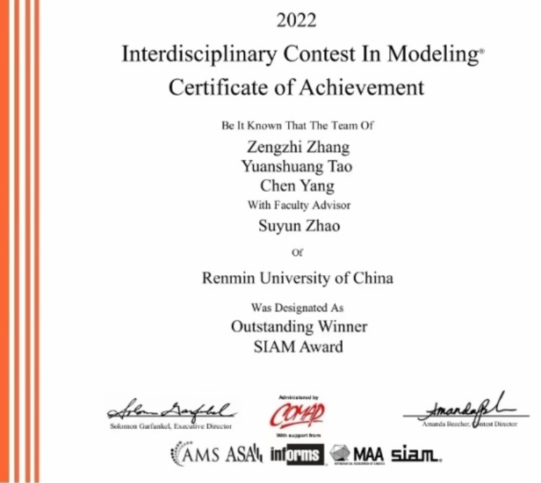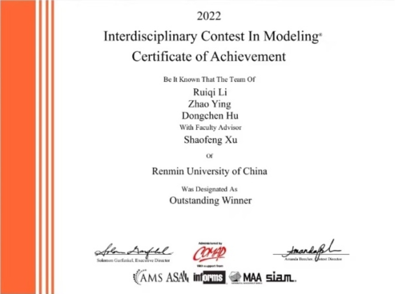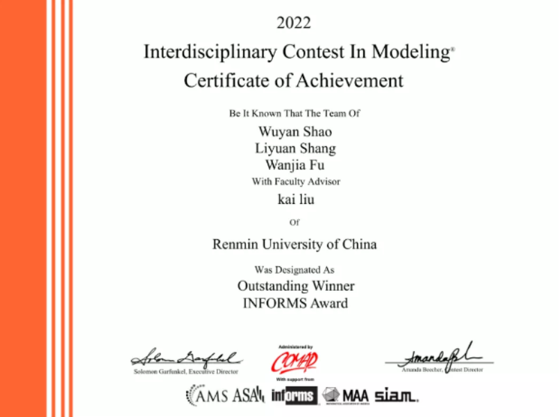 2022年美国老员工数学建模竞赛(MCM/ICM)结果日前揭晓,中国人民大学共有103支参赛队伍获奖,取得了非常可喜的成绩。全球共评出特等奖(Outstanding Winner)44组,获奖比例仅为0.16% (<1%)。但是,公司学子克服困难,勇攀高峰,共有3支队伍获得该奖项,是全球获得特等奖数量最多的高校!此外还有6支队伍获得特等奖提名(Finalists Winner),24支队伍获得一等奖(Meritorious Winner),70支队伍获得二等奖(Honorable Mention)。财政金融公司的张增智、陶芫塽和杨晨组成的团队获特等奖,同时还问鼎了美国工业与应用数学学会特别奖(SIAM Award,简称SIAM奖)。美国工业与应用数学学会奖(SIAM Award)是美国工业与应用数学学会自1988年开始在美国老员工数学建模竞赛中设立的奖项,该奖被认为是数学建模竞赛中的最高奖项之一。自设奖以来,获奖团队大多来自世界一流大学,如哈佛大学、麻省理工公司、加州理工大学。在此之前中国高校获得此奖的有清华大学、浙江大学、武汉大学、华中科技大学等十余所高校。公司在去年实现零的突破的基础上,今年连续获得SIAM奖。统计公司邵午言、劳动人事公司尚丽源以及统计公司付萬嘉组成的队伍也获得特等奖,同时还获得国际运筹学与管理科学冠名奖(INFORMS Award)。经济公司李睿齐和财政金融公司的赵莹、胡东辰组成的团队也获得了特等奖。这是公司自参加美赛以来获得特等奖数量最多的一年。值得一提的是,公司中法公司也有三组同学获得一等奖,一组同学获得二奖项,这是中法学子的历史最好成绩!祝贺所有获奖的同学们!