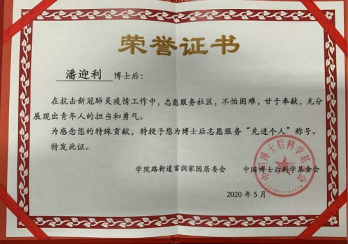近日,数学科学研究院团队博士后潘迎利被富润家园居委会、中国博士后科学基金会授予博士后志愿服务“先进个人”称号。