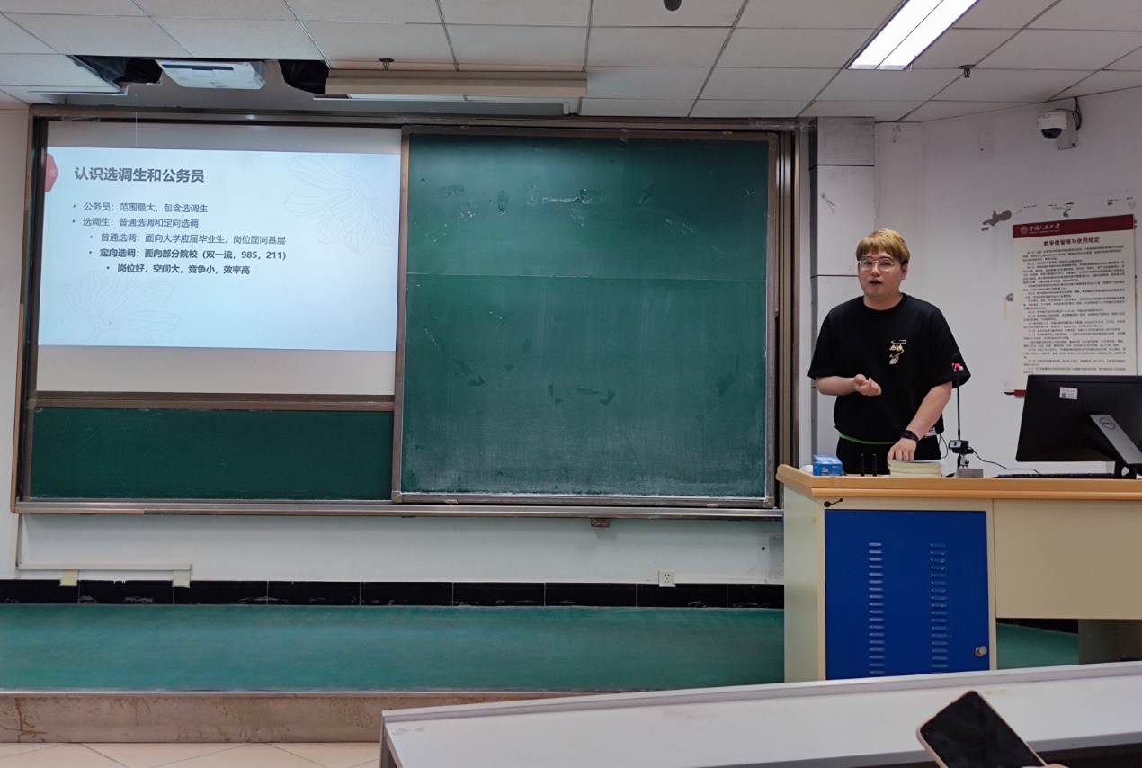 首先由王子阳同学为大家分享了选调生和公务员的求职经验。他为大家讲解了公务员的考试类型,分享了他的考试经历、考试准备等方面,给出了备考建议以及考试时的注意事项。他不仅为师弟师妹们讲解了行测、申论等备考建议,也分享了自己使用的题册及做题心得。期间,他说到了认真准备、放松心态、坚定道路的重要性。并在最后带领大家浏览了他所在单位的招聘流程以及招聘要求,使大家对用人单位的招聘工作有了具体清晰的认识。