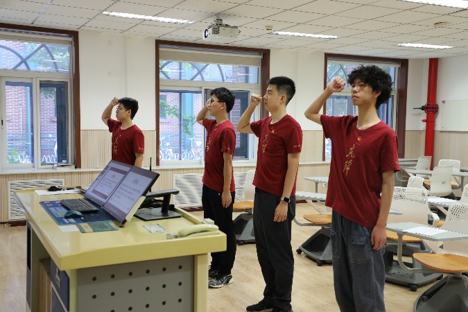 “我志愿加入中国共产主义青年团,坚决拥护中国共产党的领导……”在新团员代表任达的带领下,四名团员右手握拳,庄严宣誓。一声声铿锵有力的誓言在教室内回荡,握紧的右拳表明团员们坚定的信念和决心。