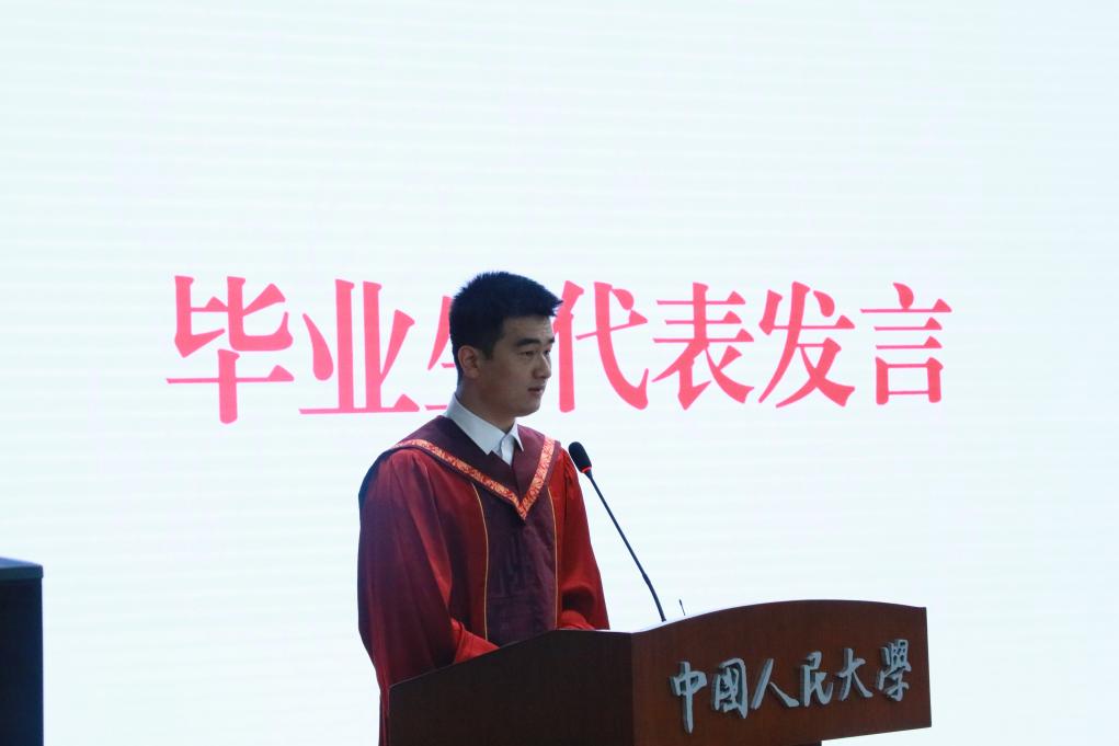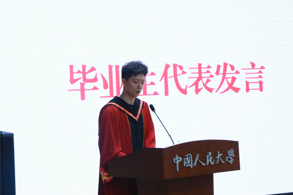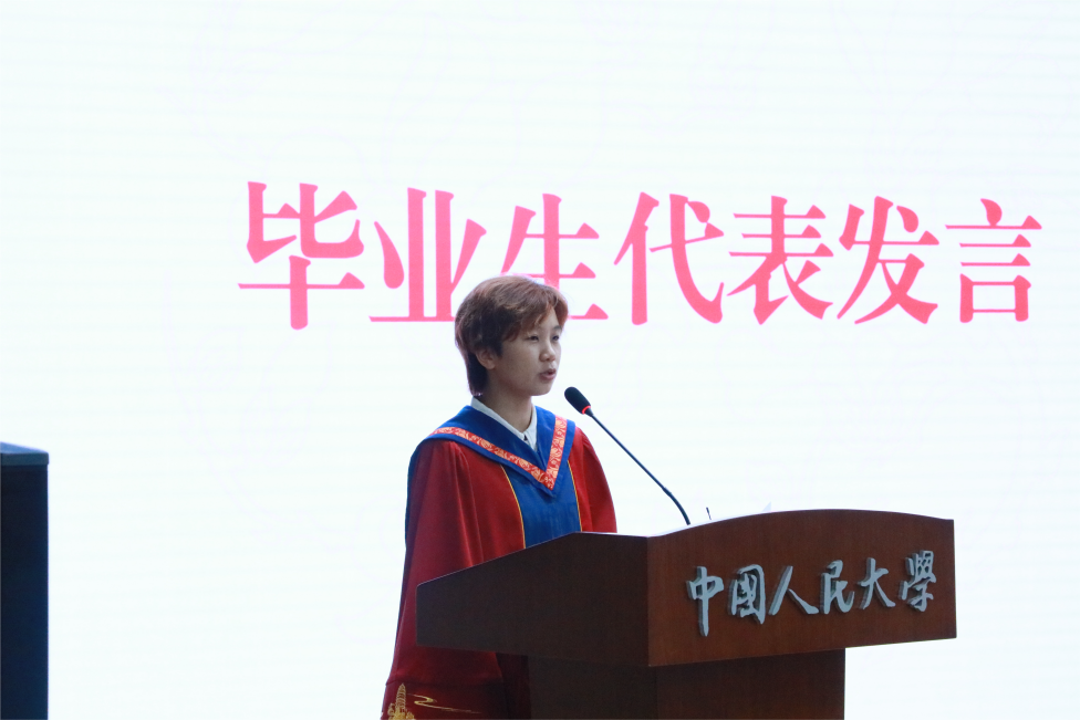 硕士毕业生代表黄梦笛在发言中回溯了自己在人民大学威廉体育的三年时光,回忆了研究生期间经历的许多平凡但感动的难忘瞬间,感恩老师的“指导与点拨”、同学的“支持与互助”。她表示,母校赋予的“独立思考能力与严谨治学精神”是终身财富,鼓励同学们要将小我融入祖国的大我之中,以知识为剑、以责任为盾,在挑战中把握机遇,勇于担当、积极作为,在各自的领域中发光发热,不负时代,不负培养!