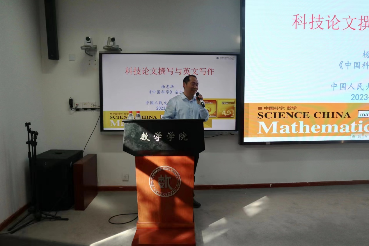 杨志华教授是中国科学技术期刊编辑学会青年工作委员会委员,曾获中国科公司《中国科学》《科学通报》优秀编辑、中国科技期刊卓越行动计划优秀编辑等奖项。他所负责的《中国科学:数学》 (中、英文刊)是我国最具影响力和代表性的数学综合性学术期刊。在本次讲座中,他结合自己的工作经历,聚焦学术论文写作方法这一广泛受到关注的问题,向同学们作了深入浅出地讲解,并提出了自己的建议。
