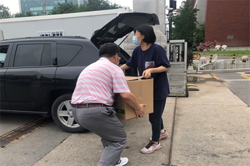 旋天颖老师和韩丽涛老师小心搬运每一件行李